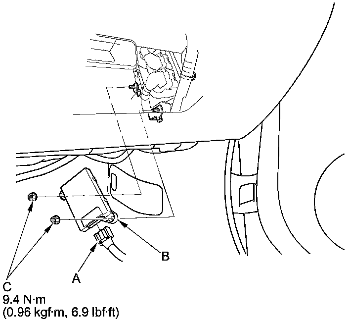 4. Remove the nuts (C) and the HandsFreeLink control unit.