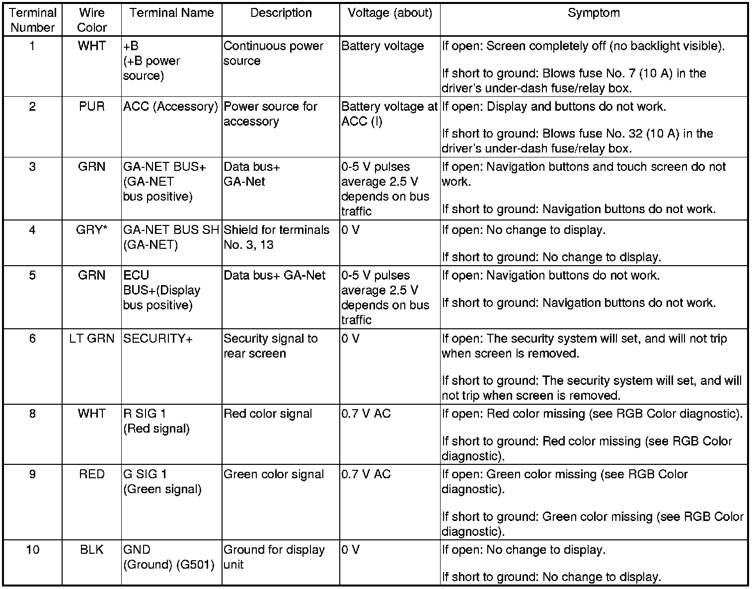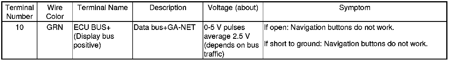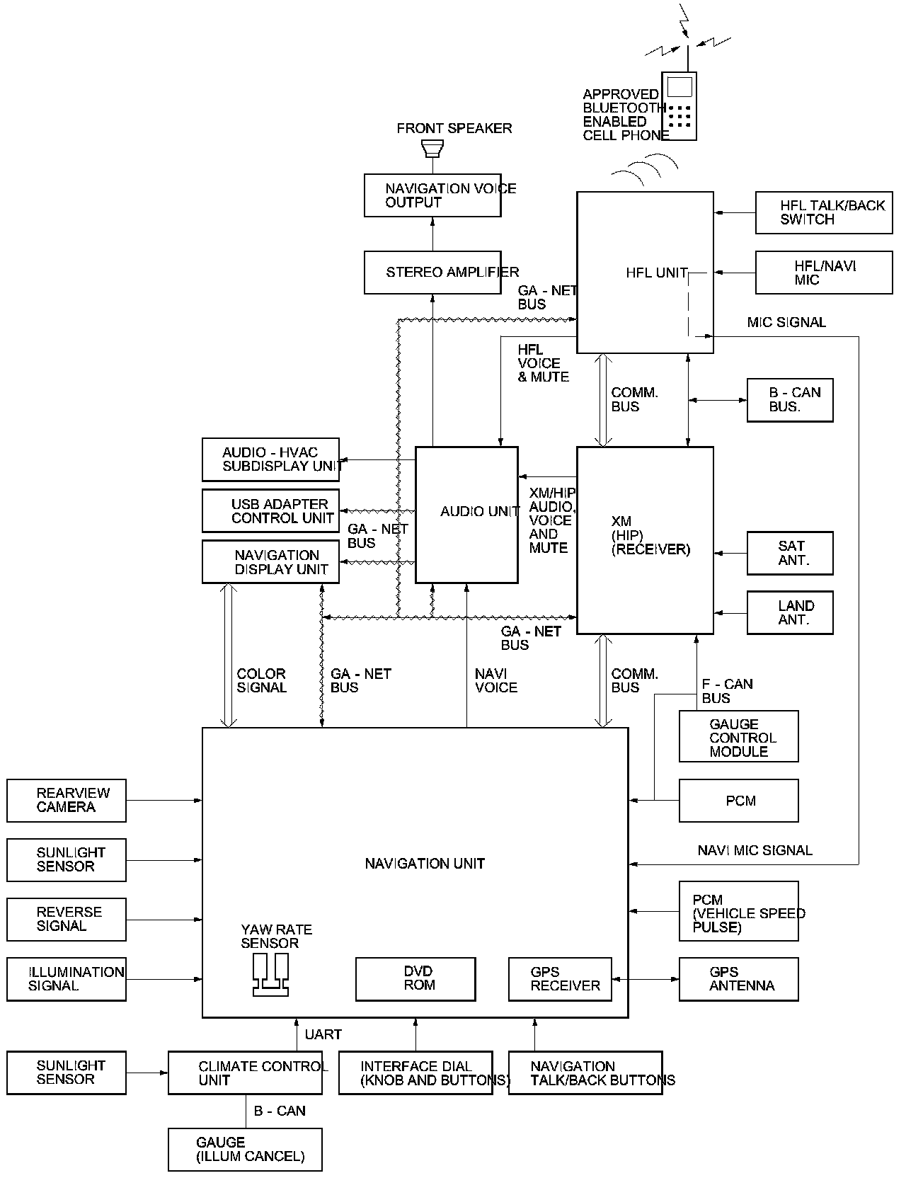 The GA-NET II communication bus passes information back and forth between the navigation display unit, the navigation unit and the audio system, The information passed on this bus are audio and climate control settings directed by the navigation unit.