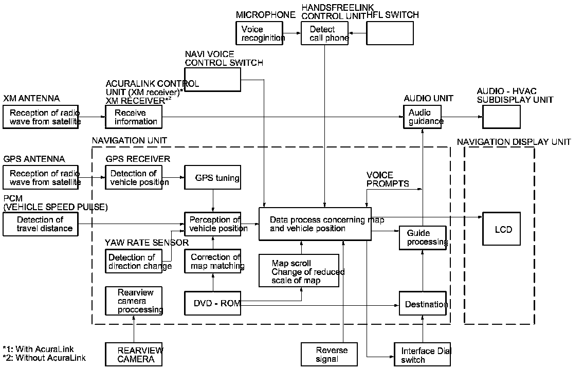 The navigation system is composed of the navigation unit, the PCM (vehicle speed pulse) AcuraLink control unit (XM receiver) (traffic and weather information), HandsFreeLink control unit (to send a POI phone number or place a call), the GPS antenna, the microphone, the voice control switch, the audio unit, the audio-HVAC sub display unit.