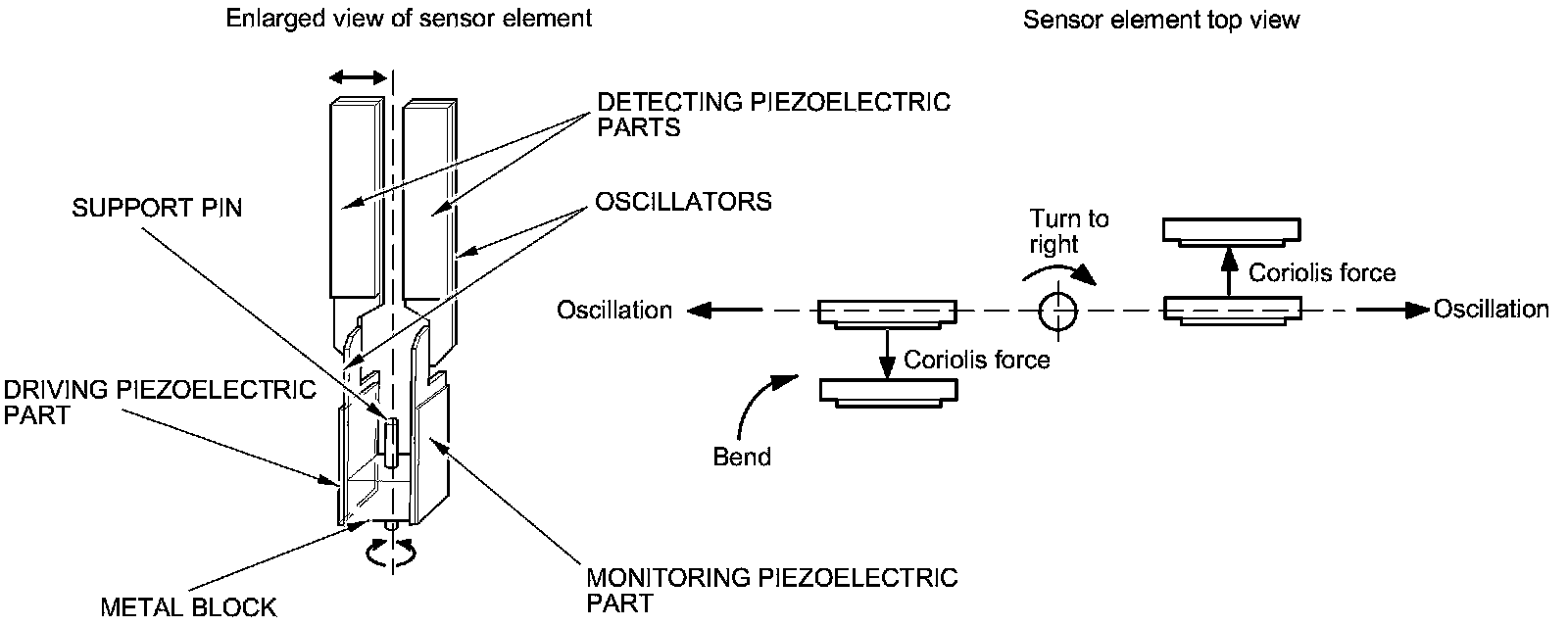 - When the vehicle turns to the right, the sensor element moves in a circular motion with the right oscillator bending forward and the left oscillator bending rearward. The amount of forward/rearward bend varies according to the angular velocity of the vehicle.
