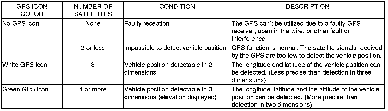 The navigation system receives signals from the global positioning system (GPS), a network of 24 satellites in orbit around the earth. By receiving signals from several of these satellites, the navigation system can determine the latitude, longitude, and elevation of the vehicle. In addition, signals from the system's yaw rate sensor and the PCM (vehicle speed pulse) enable the system to keep track of the vehicle's direction and speed of travel.