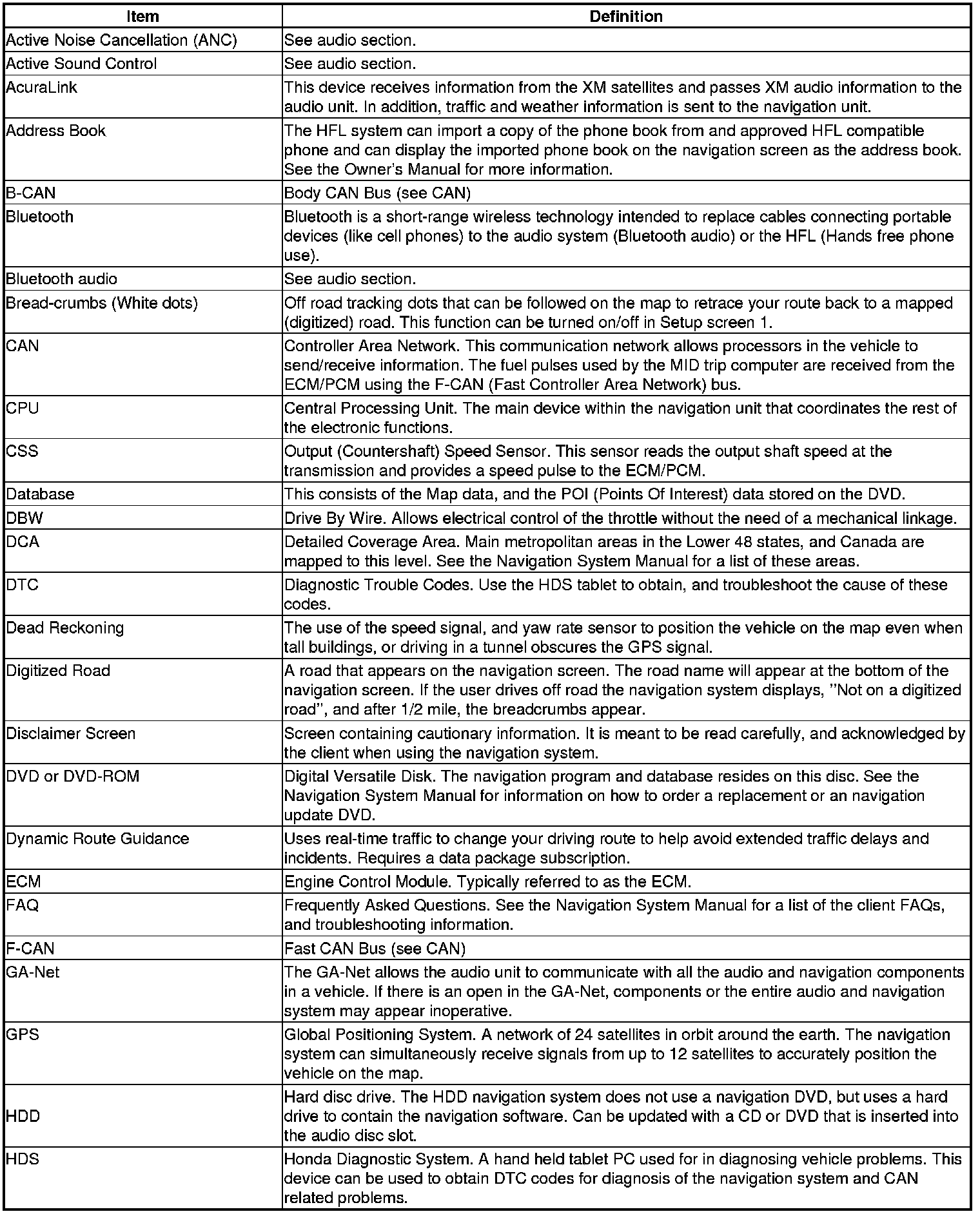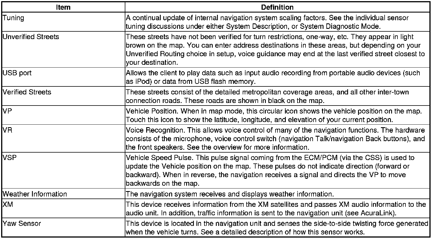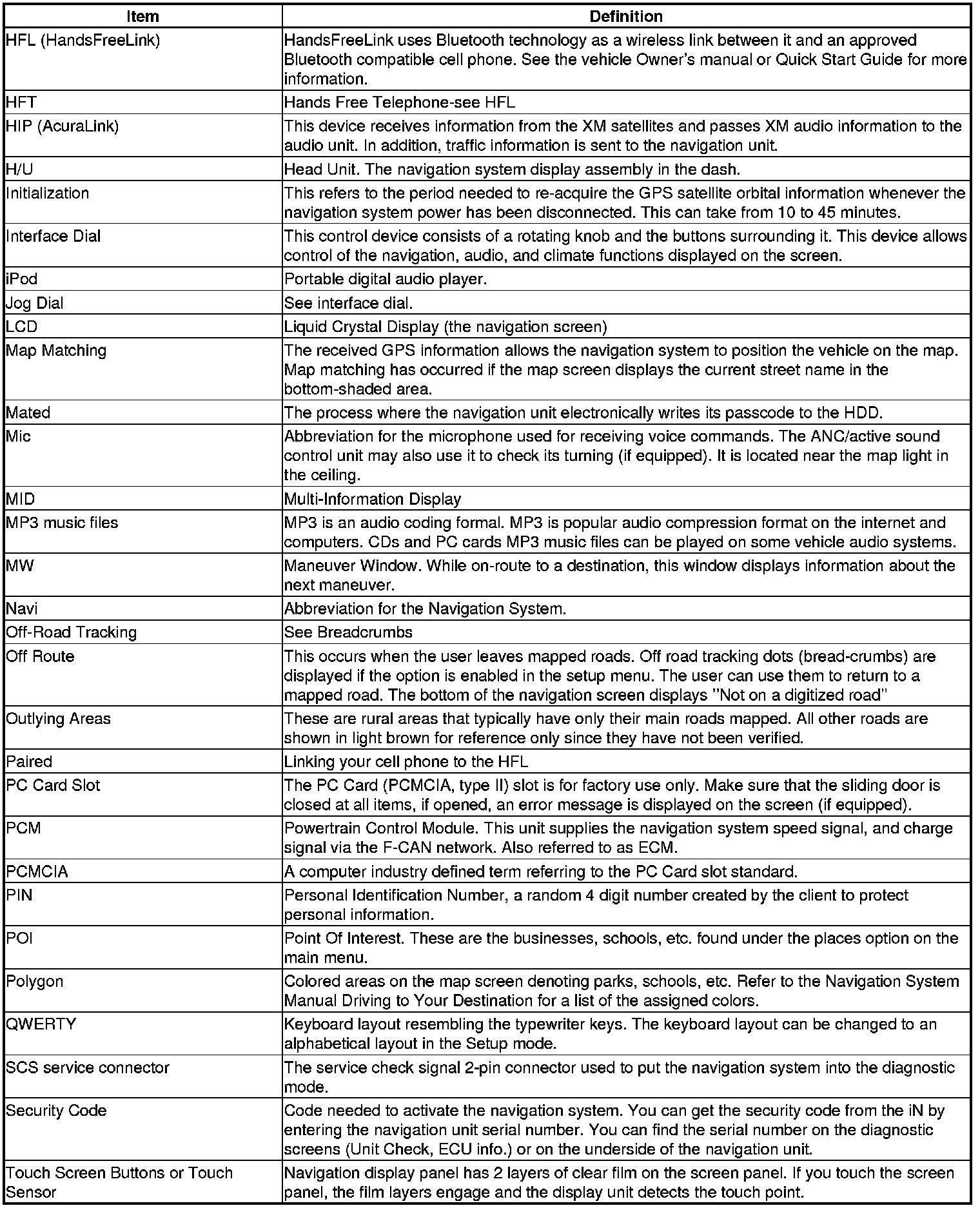 The following is a glossary of terms pertaining to the Voice Recognition Navigation System.