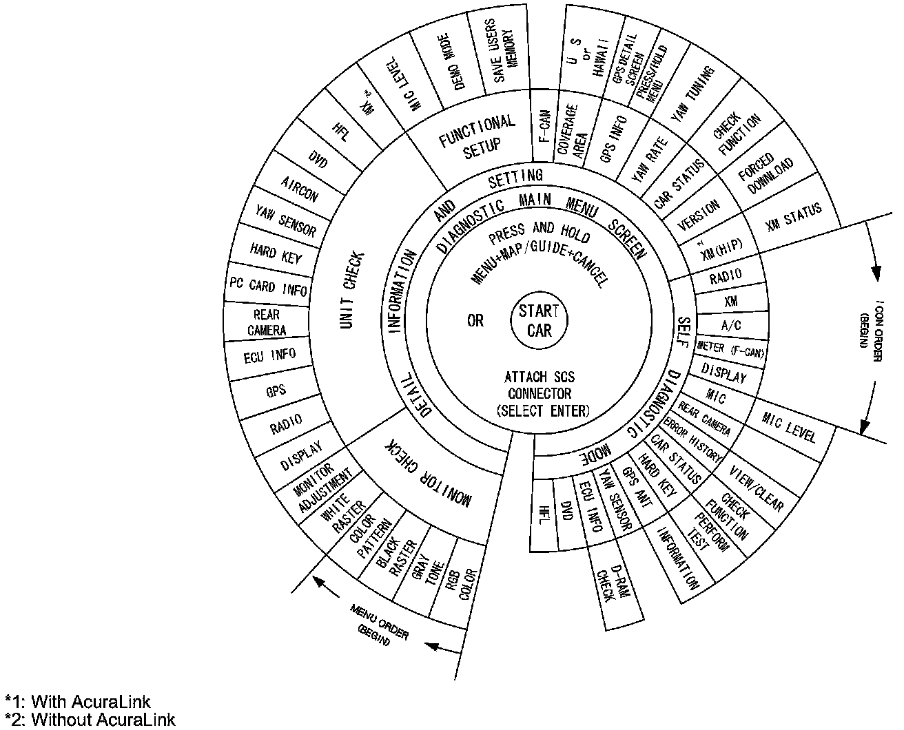 Access to the diagnostic features begins by starting the vehicle. This is necessary so the system can check the other systems connected by various busses. After starting the vehicle you can enter the diagnostic mode either by pressing and holding MENU, MAP/GUIDE, CANCEL, or by connecting the 2-PIN SCS service connector.