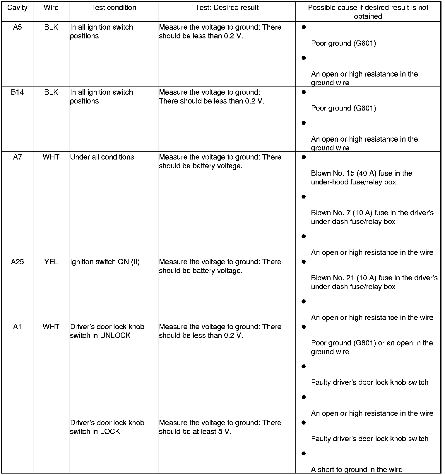 6. Reconnect the connectors to the driver's under-dash fuse/relay box, turn the ignition switch to ON (II), and do the following input tests.