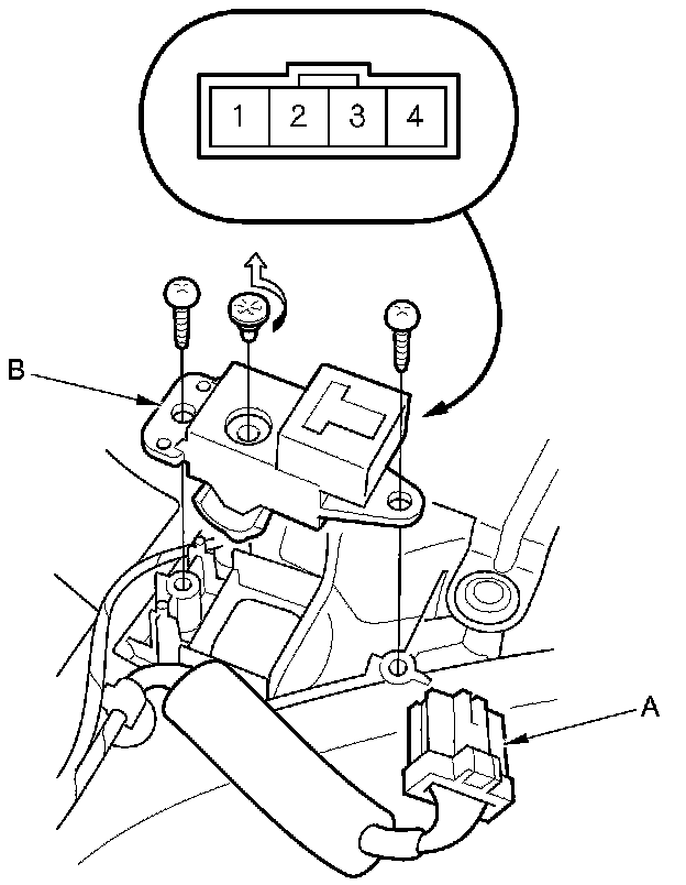 2. Disconnect the 4P connector (A), remove the two screws, then remove the door lock switch (B).