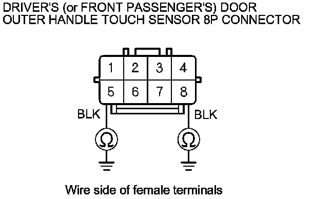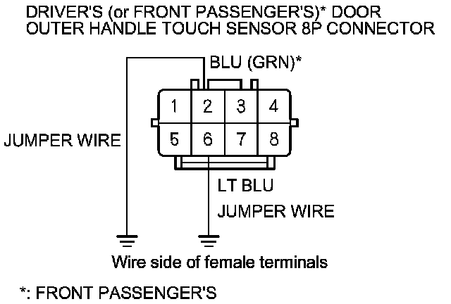 12. Connect driver's (or front passenger's)* door outer handle touch sensor 8P connector terminals No. 2 and No. 6 to body ground with jumper wires.
