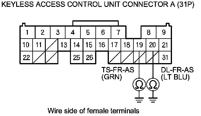 13. Check for continuity between keyless access control unit connector A (31P) terminals No. 19 and No. 20 and body ground (for front passenger's door touch sensor) or between keyless access control unit connector B (24P) terminals No. 22 and No. 23 and body ground (for driver's door touch sensor).