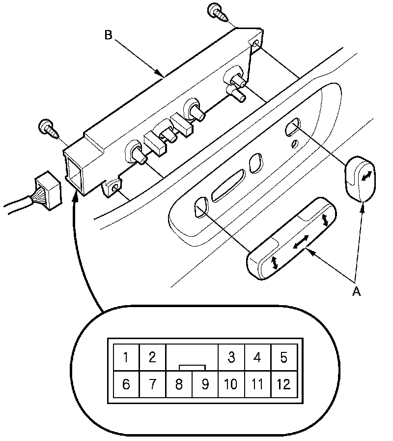 1. Remove the power seat adjustment switch knobs (A) and recline cover from the driver's power seat Front Seat Cushion Cover Replacement, then remove the two screws and the power seat adjustment switch (B).