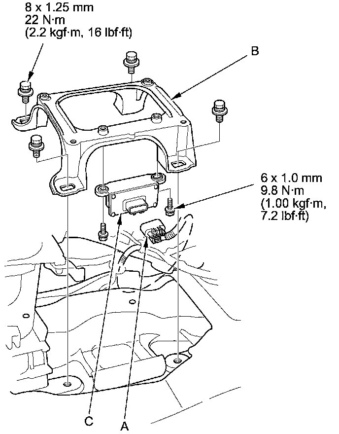 5. Pull out the shift lever bracket base (B) with the yaw rate-acceleration sensor (C).