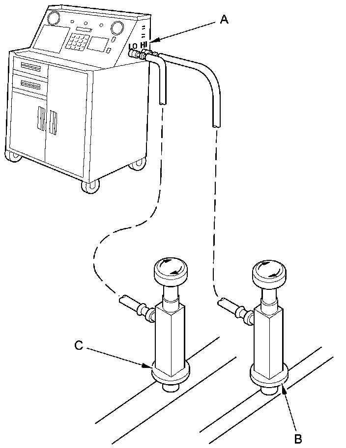 1. Connect an R-134a refrigerant recovery/recycling/charging station (A) to the high-pressure service port (B) and the low-pressure service port (C), as shown, following the equipment manufacturer's instructions.