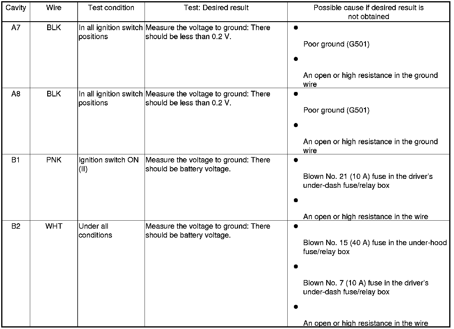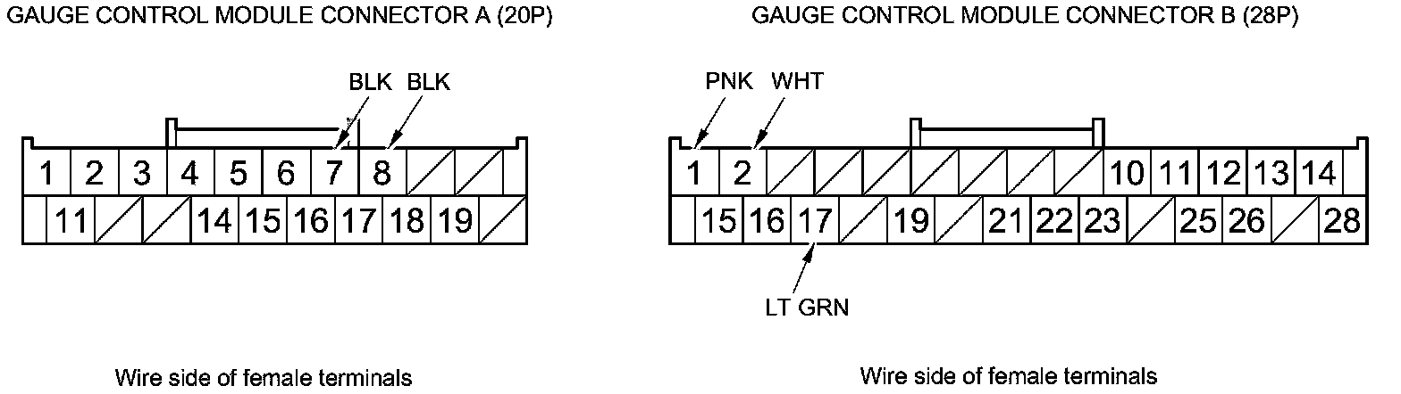 6. Disconnect gauge control module connectors A (20P) and B (28P), and do the following input tests.