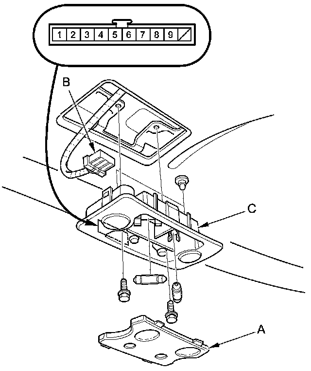 3. Disconnect the 10P connector (B) from the rear map light (C).