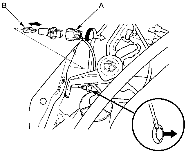 3. For the right parking light/front side marker light, remove the clip from the windshield washer reservoir.