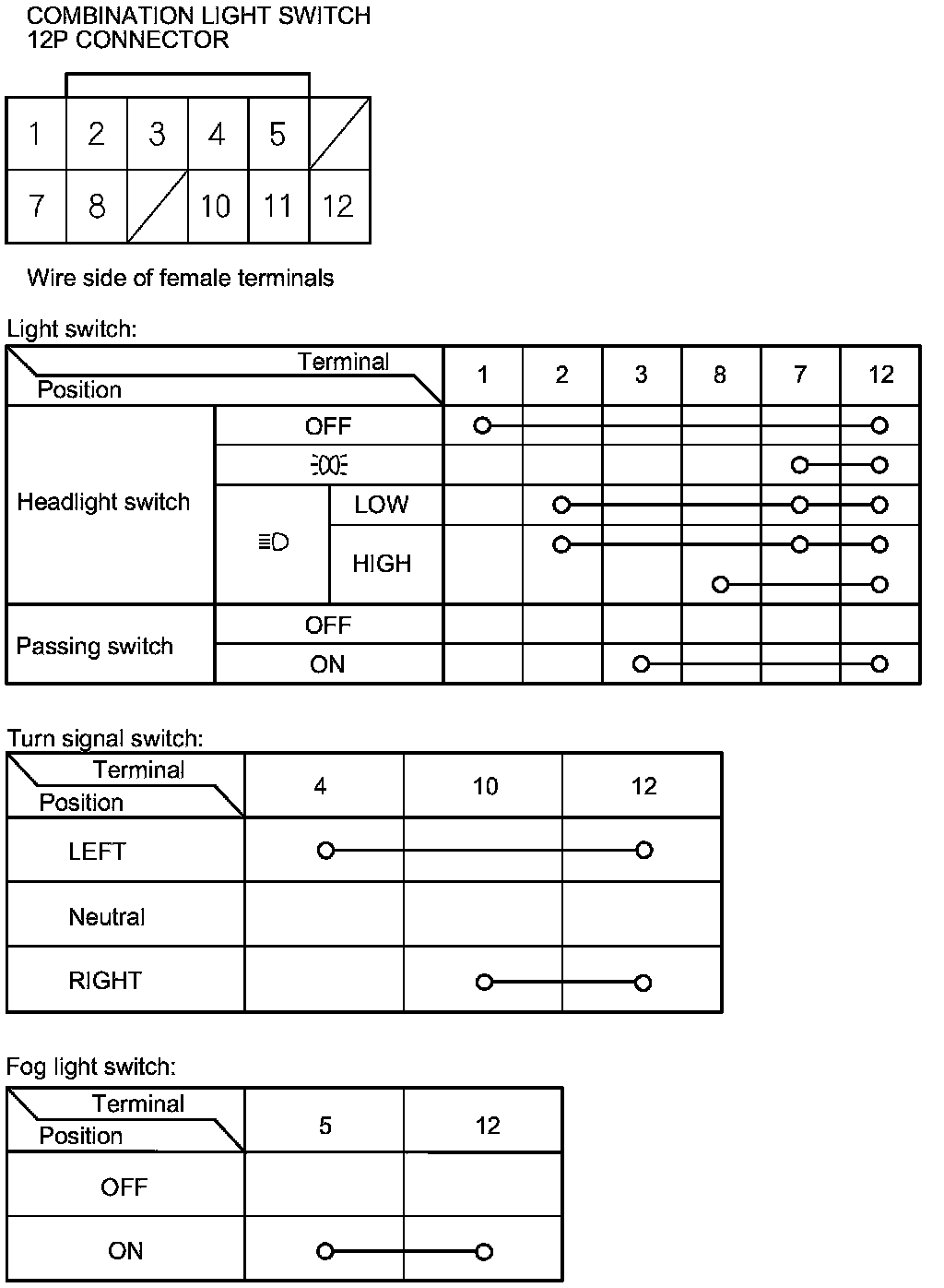 - If the terminals look OK, check for continuity between the terminals in each switch position according to the tables.
