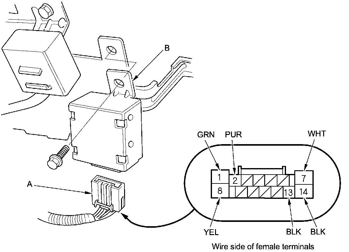 2. Disconnect the 14P connector (A) from the daytime running lights control unit (B).