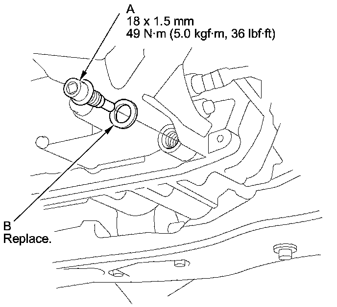 4. Remove the drain plug (A) and the sealing washer (B), and drain the automatic transmission fluid (ATF).