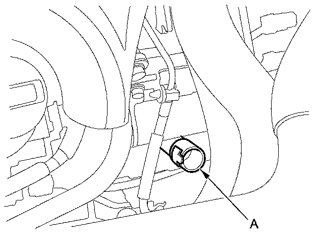 7. Remove the ATF dipstick, and refill the transmission with the recommended fluid through the dipstick guide tube opening (A). Always use Acura ATF DW-1 Automatic Transmission Fluid (ATF). Using a non-Acura ATF can affect shift quality.
