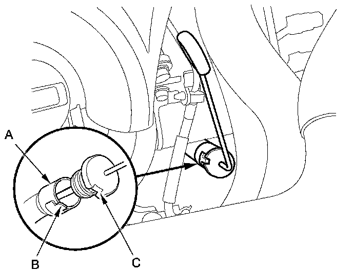 8. Install the dipstick back into the dipstick guide tube (A) aligning the notch (B) with the guide tab (C).