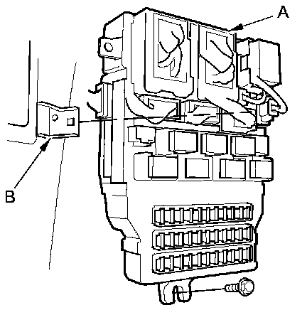 4. Remove the mounting bolt, release the tab (B) and pull the driver's under-dash fuse/relay box away from the body.