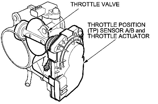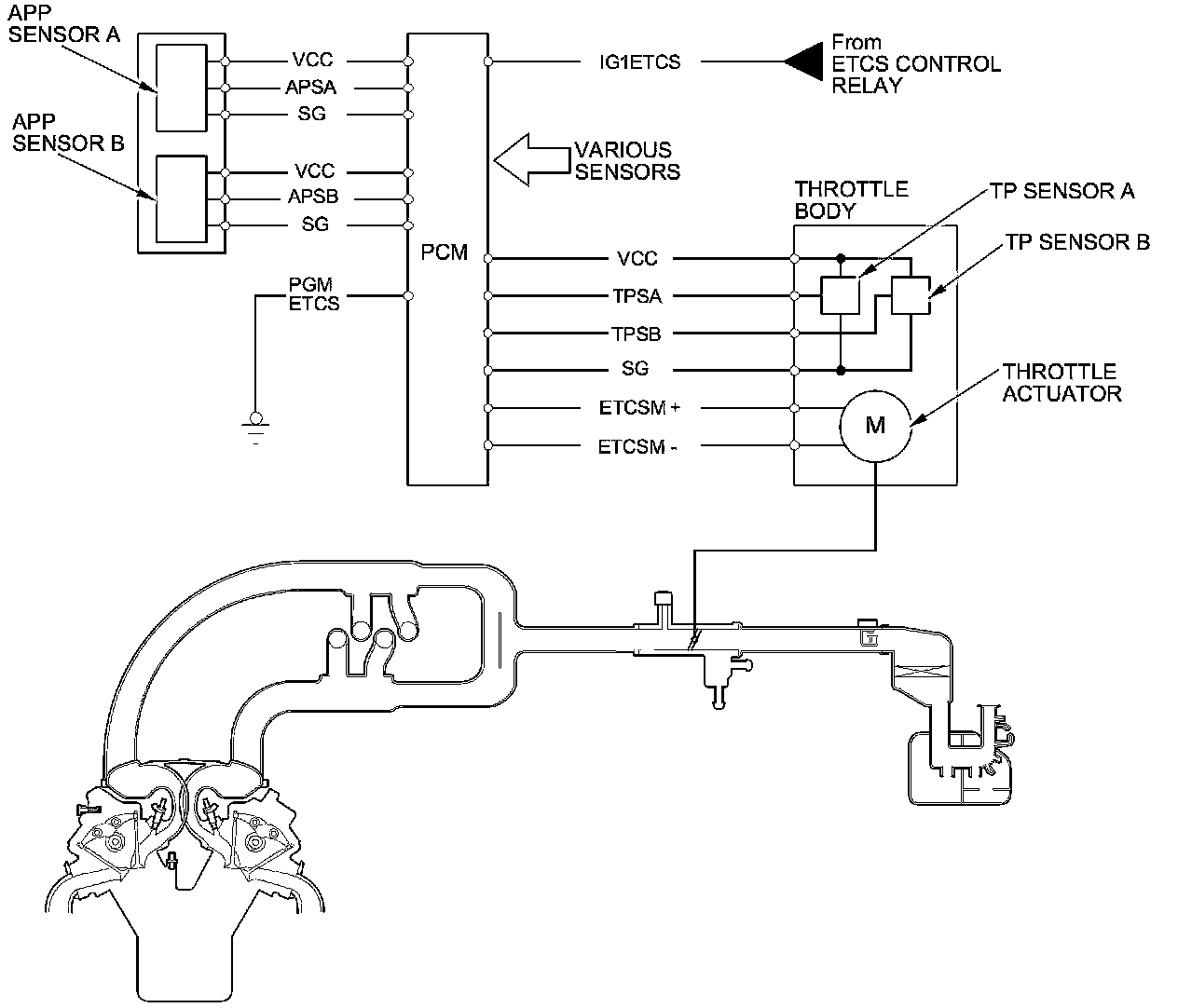 The electronic throttle control system consists of the throttle actuator, throttle position (TP) sensor A/B, accelerator pedal position (APP) sensor A/B, the electronic throttle control system (ETCS) control relay, and the PCM.