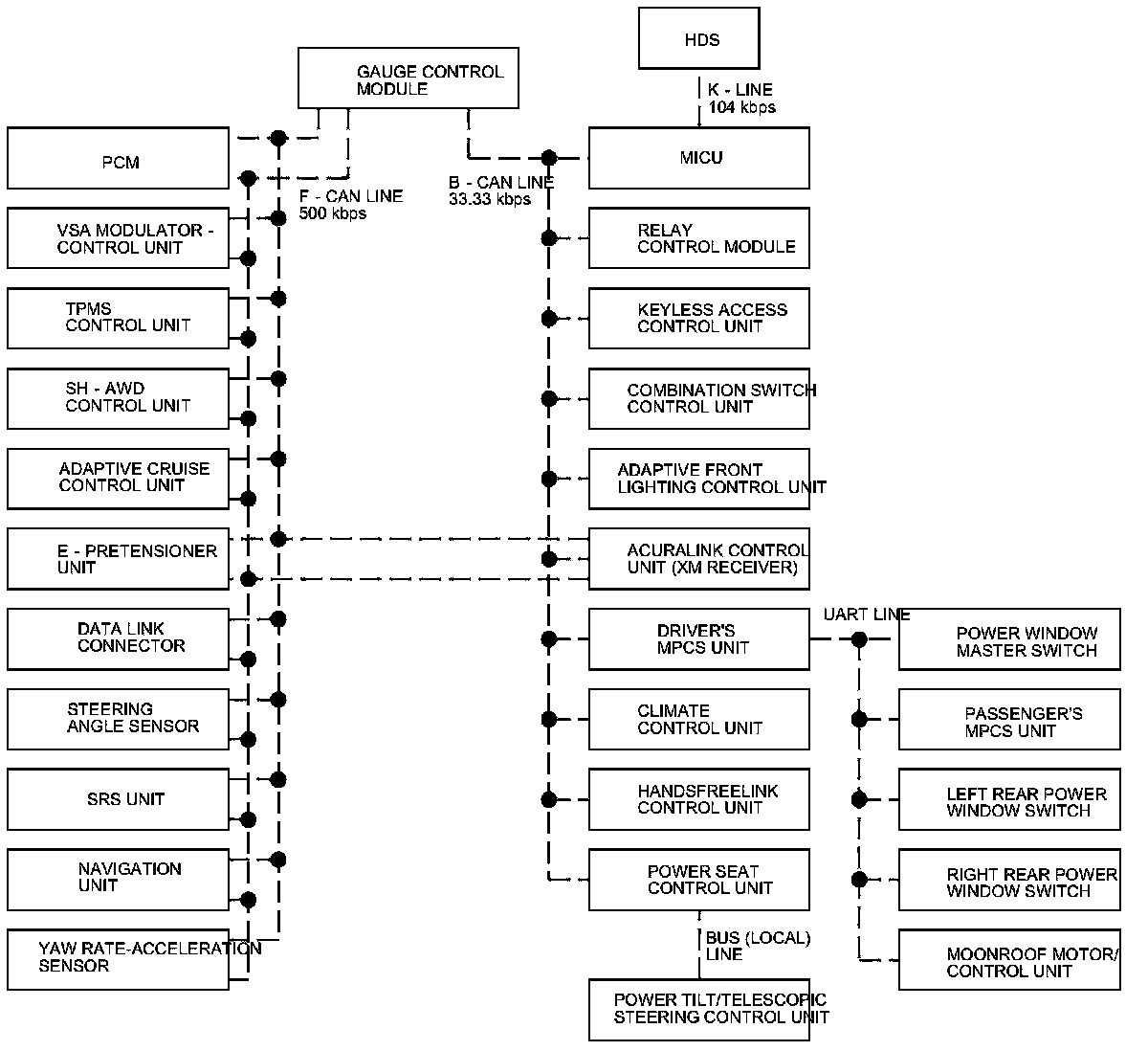 The fast controller area network (F-CAN) and the body controller area network (B-CAN) share information between multiple electronic control units (ECUs). B-CAN communication moves at a slower speed for convenience related items and for other functions. F-CAN information moves at a faster speed for "real time" functions such as fuel and emissions data. To allow both systems to share information, the gauge control module translates and relays the information from the B-CAN to the F-CAN and from the F-CAN to the B-CAN. This is called the Gateway Function.