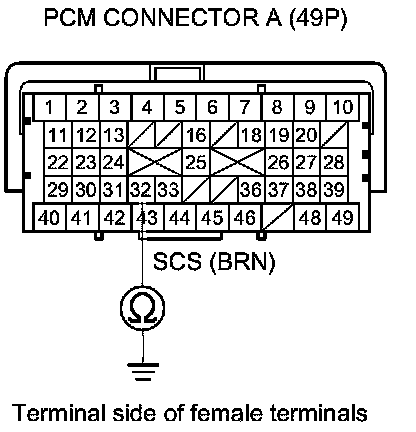8. Check for continuity between PCM connector terminal A32 and body ground.