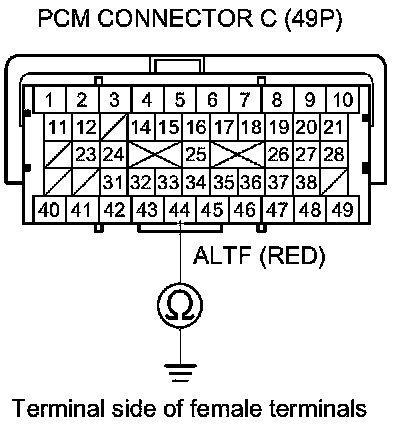 8. Check for continuity between PCM connector terminal C44 and body ground.
