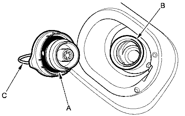 2. Check the fuel fill cap seal (A) and the fuel fill pipe mating surface (B). Make sure that the fuel fill cap tether cord (C) is not caught under the cap.