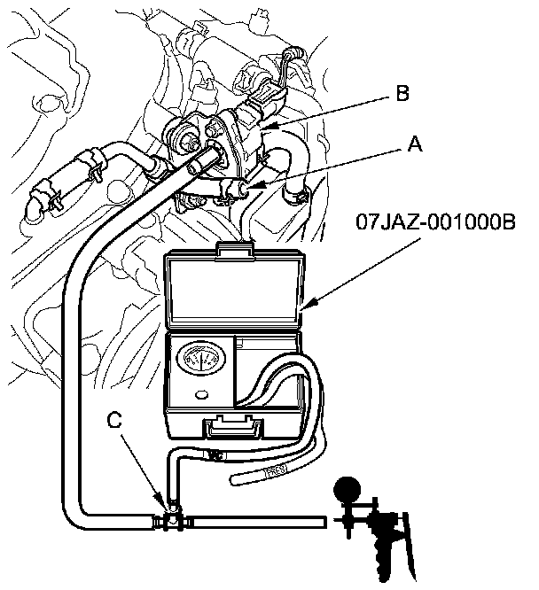 8. Disconnect the vacuum hose (A) from the EVAP canister purge valve (B) in the engine compartment, then connect a T-fitting (C), a vacuum gauge, and a vacuum pump/gauge, 0-30 inHg, to the EVAP canister purge valve as shown.