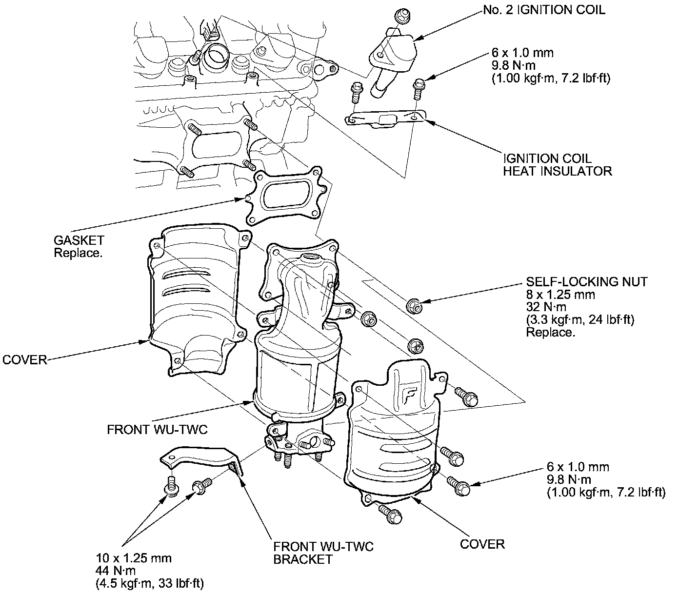 4. Remove the front A/F sensor (Sensor 1) A/F Sensor Replacement and the front secondary HO2S (Sensor 2) Secondary HO2S Replacement.