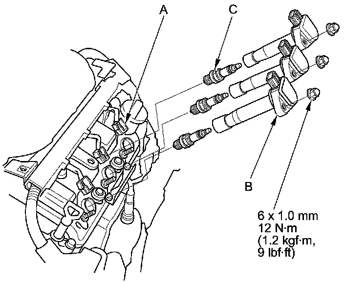 4. Disconnect the ignition coil connectors (A), then remove the front ignition coils (B).