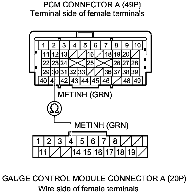 9. Check for continuity between PCM connector terminal A23 and gauge control module connector terminal A4.