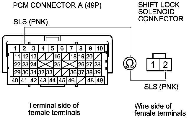 15. Check for continuity between PCM connector terminal A2 and shift lock solenoid connector terminal No. 2.