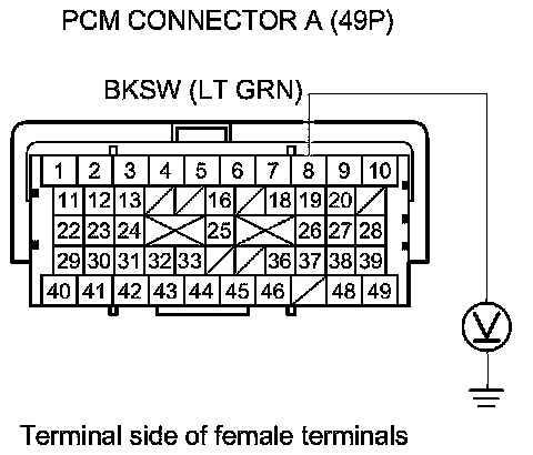 20. Measure the voltage between PCM connector terminal A8 and body ground while pressing the brake pedal and when the brake pedal is released.