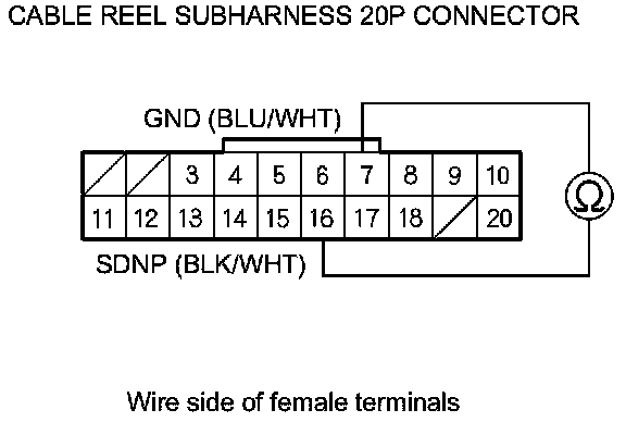 2. Check for continuity between cable reel subharness 20P connector terminals No. 7 and No. 16 when pressing the paddle shifter - (downshift switch) and when the paddle shifter - (downshift switch) is released.
