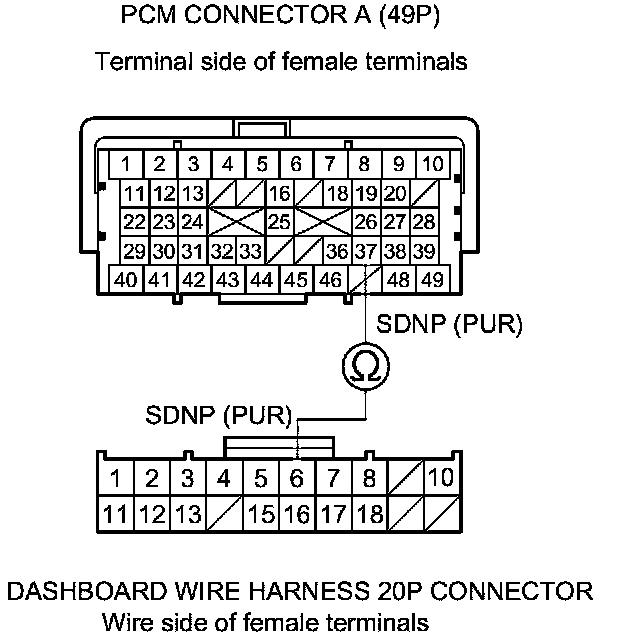 13. Check for continuity between PCM connector terminal A37 and dashboard wire harness 20P connector terminal No. 6.