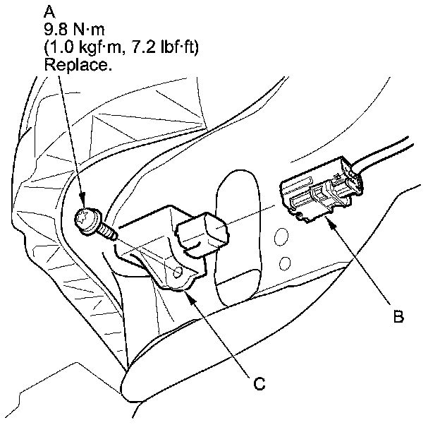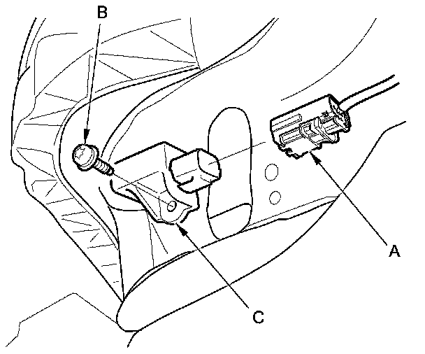 1. Install the front impact sensor with new TORX bolt (A), then connect the engine compartment wire harness 2P connector (B) to the front impact sensor (C).