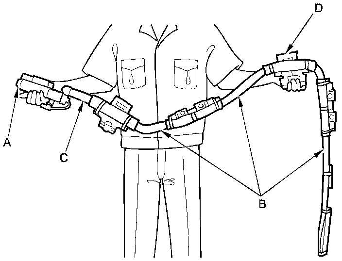 - The side curtain airbag module assembly is a long, jointed part containing an inflator (A), a flexible bag (B), an adapter pipe (C), and a center bracket (D). When removing or installing the side curtain airbag assembly, never: