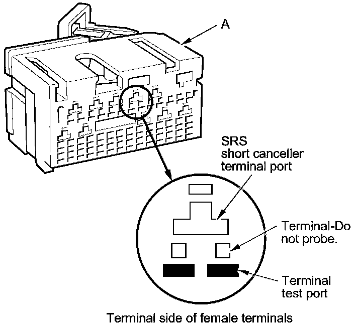 When diagnosing or troubleshooting at an SRS unit connector (A), use the terminal test port below the terminal you need to check. Gently insert the pin probes of the tester or jumper wire at the terminal test port from the terminal side.