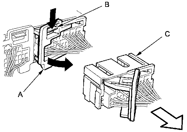To release the lock, pull the lever (A) while pushing the lock (B) on the outside of the connector, then pull out the connector (C).