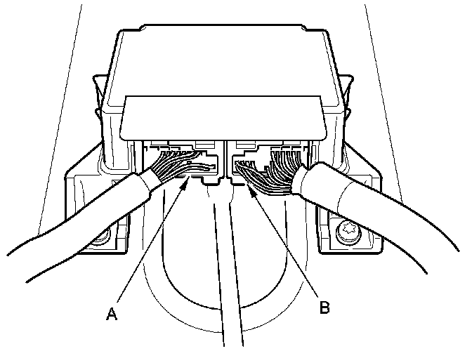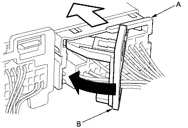 To reconnect the connector, push in on the connector (A). As the connector is pressed in, the lever (B) moves to the locked position.