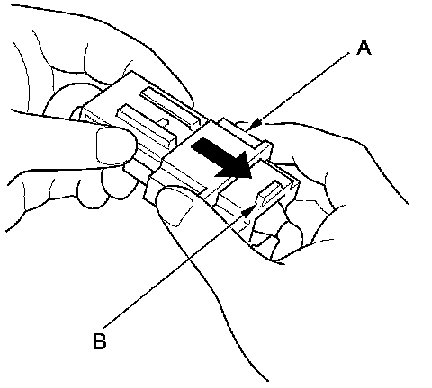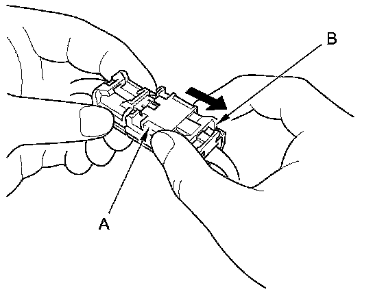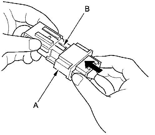 1. To reconnect, hold the pawl-side connector, and press on the back of the sleeve-side connector in the direction shown. As the two connector halves are pressed together, the sleeve (A) is pushed back by the pawl (B). Do not touch the sleeve.