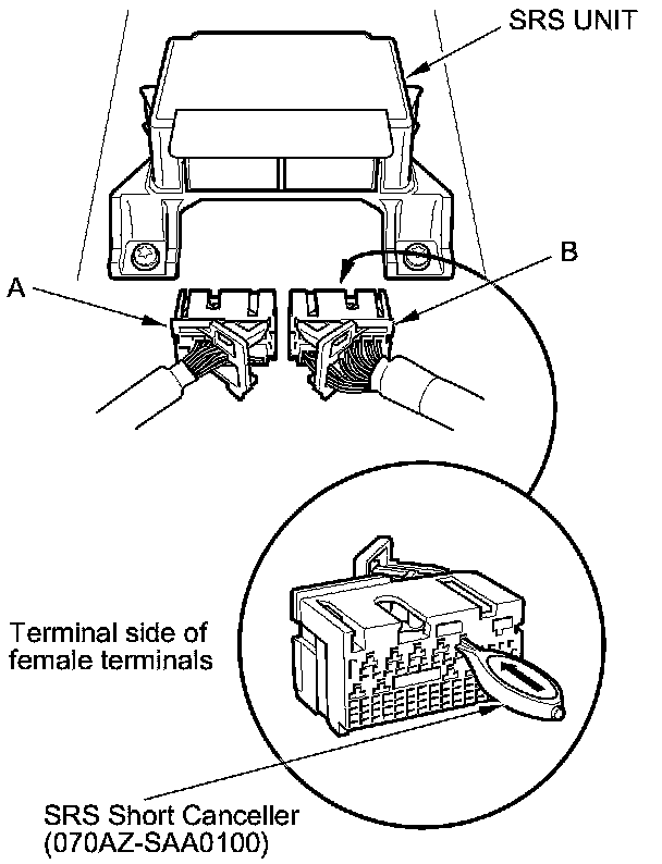 When SRS unit connectors A (39P) and B (39P) are disconnected, a short circuit is automatically created in the connector to prevent accidental deployment of an airbag or tensioner. The circuit may need to be opened when diagnosing the system. Insert an SRS short canceller (070AZ-SAA0100) in the specified cavities when necessary to keep the circuit open for diagnosis.