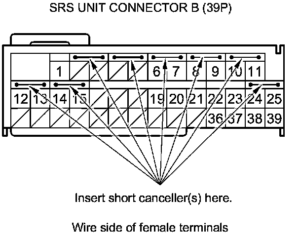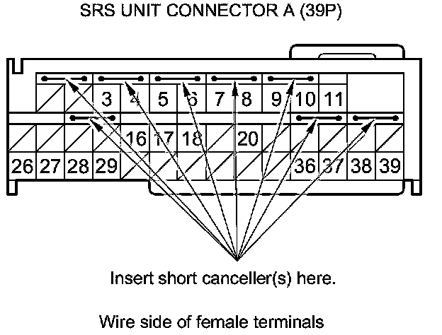 Terminal numbers are shown from the wire side of the female terminals. Insert the SRS short canceller(s) into the cavities on the terminal side of the connector.