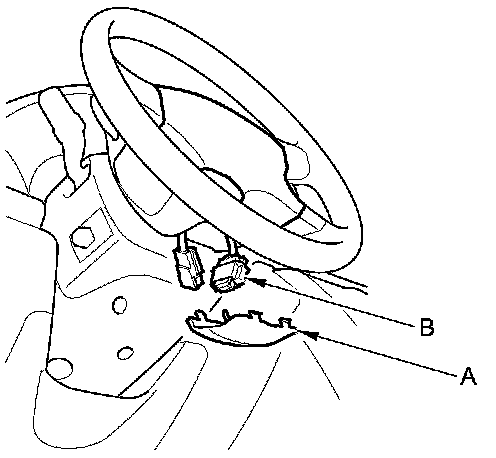 4. Remove the access panel (A) from the steering wheel, then disconnect the driver's airbag inflator 4P connector (B) from the cable reel.