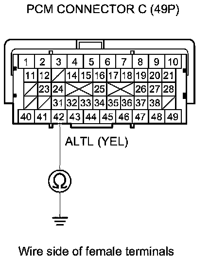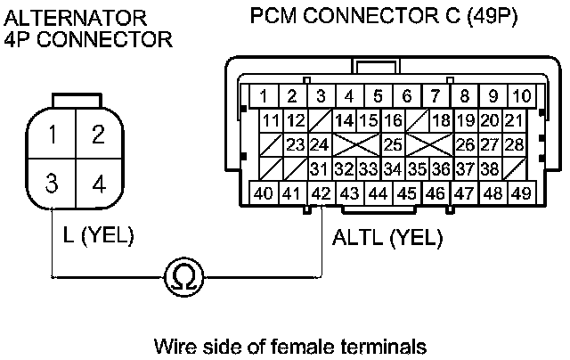 25. Check for continuity between PCM connector terminal C42 and alternator 4P connector terminal No. 3.