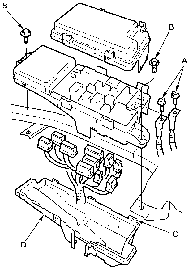 4. Release the tabs (C), and remove the bottom cover (D) from the under-hood fuse/relay box.