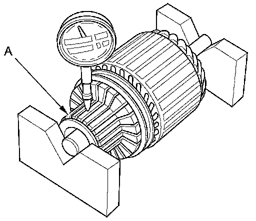 9. Use a digital caliper or dial type caliper to check the mica depth (A). If the mica depth is below the service limit, replace the armature.