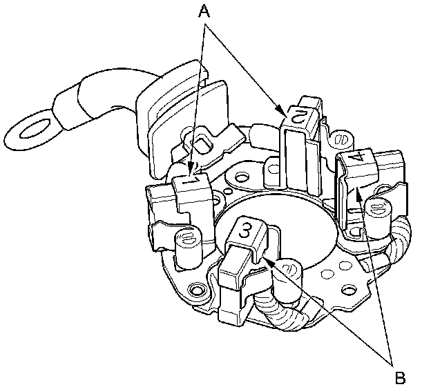 17. Check for continuity between the (+) brush holders (A) and the (-) brush holders (B). If there is continuity, replace the brush holder assembly.
