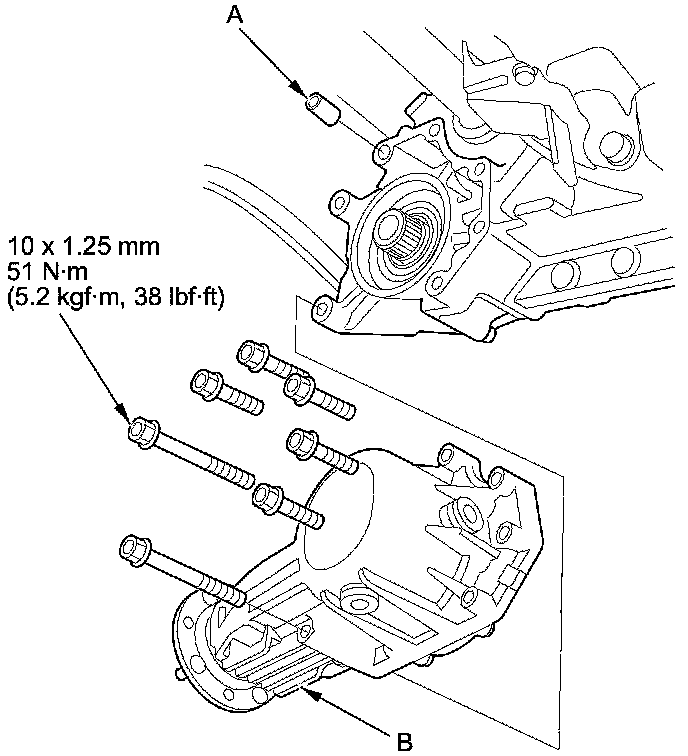 2. Install the dowel pin (A) in the transmission, and install the transfer assembly (B) on the transmission.